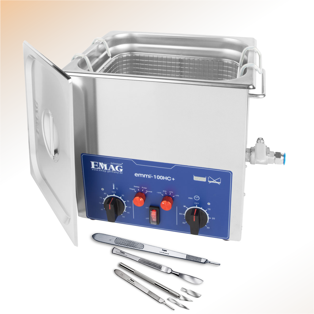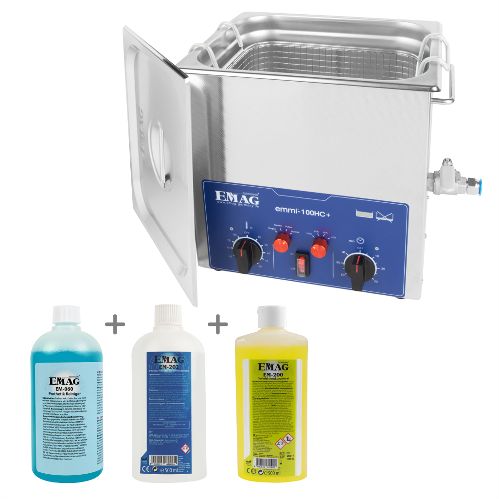 W skład zestawu wchodzi profesjonalna myjka ultradźwiękowa Emmi 100 HC Plus oraz