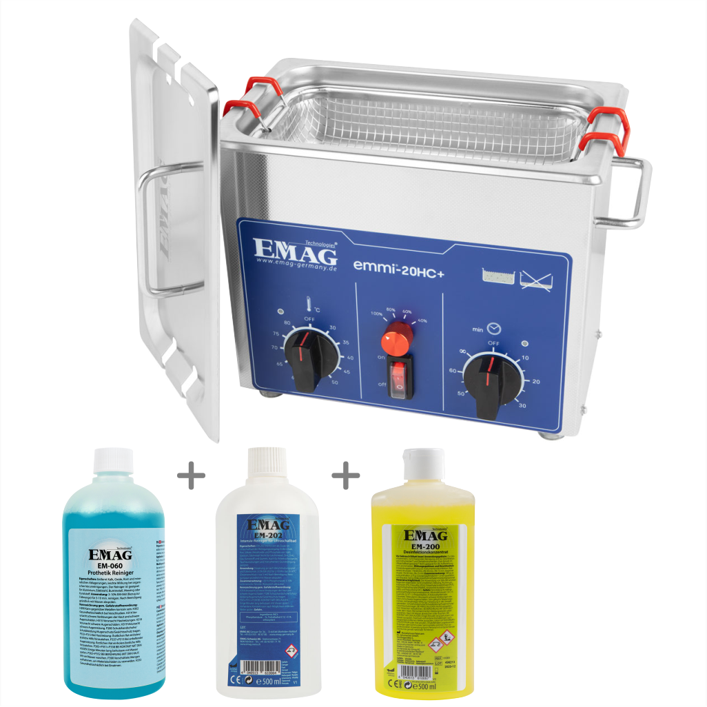 W skład zestawu wchodzi profesjonalna myjka ultradźwiękowa Emmi 20 HC oraz